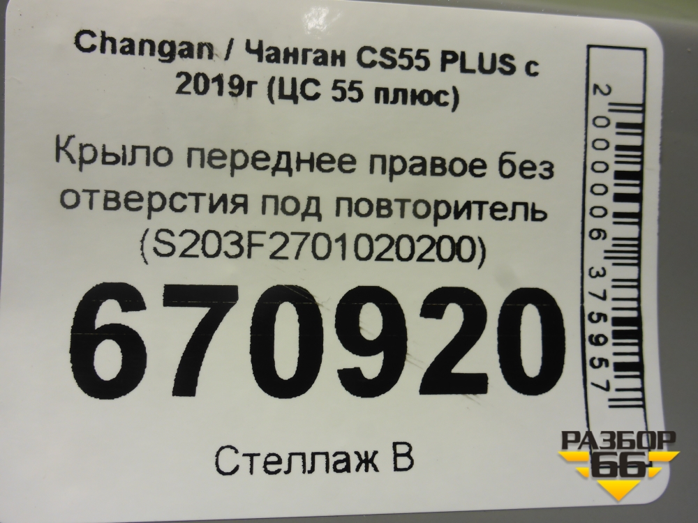 Крыло переднее правое без отверстия под повторитель (S203F2701020200) для Changan CS55 PLUS с 2019г (ЦС 55 плюс) в Краснодаре