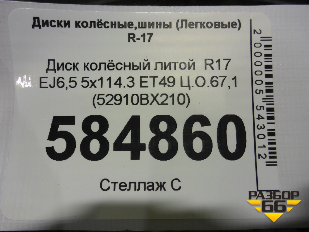 Диск колёсный литой R17 EJ6,5 5x114.3 ET49 Ц.О.67,1 (52910BX210) в Краснодаре