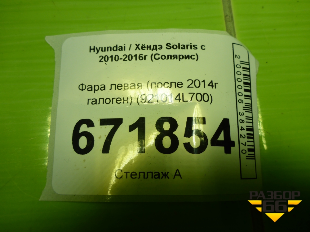 Фара левая (после 2014г галоген) (921014L700) для Hyundai Solaris с 2010-2016г (Солярис) в Краснодаре