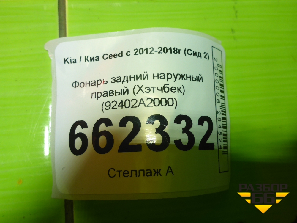 Фонарь задний наружный правый (Хэтчбек) (92402A2000) для Kia Ceed с 2012-2018г (Сид 2) в Краснодаре