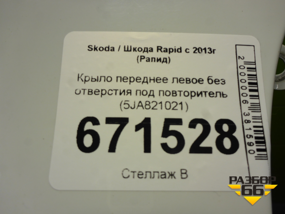 Крыло переднее левое без отверстия под повторитель (5JA821021) для Skoda Rapid с 2013г (Рапид) в Краснодаре