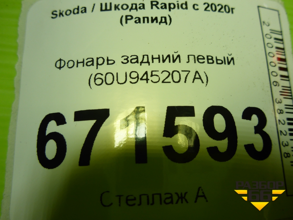 Фонарь задний левый (60U945207A) для Skoda Rapid с 2020г (Рапид) в Краснодаре