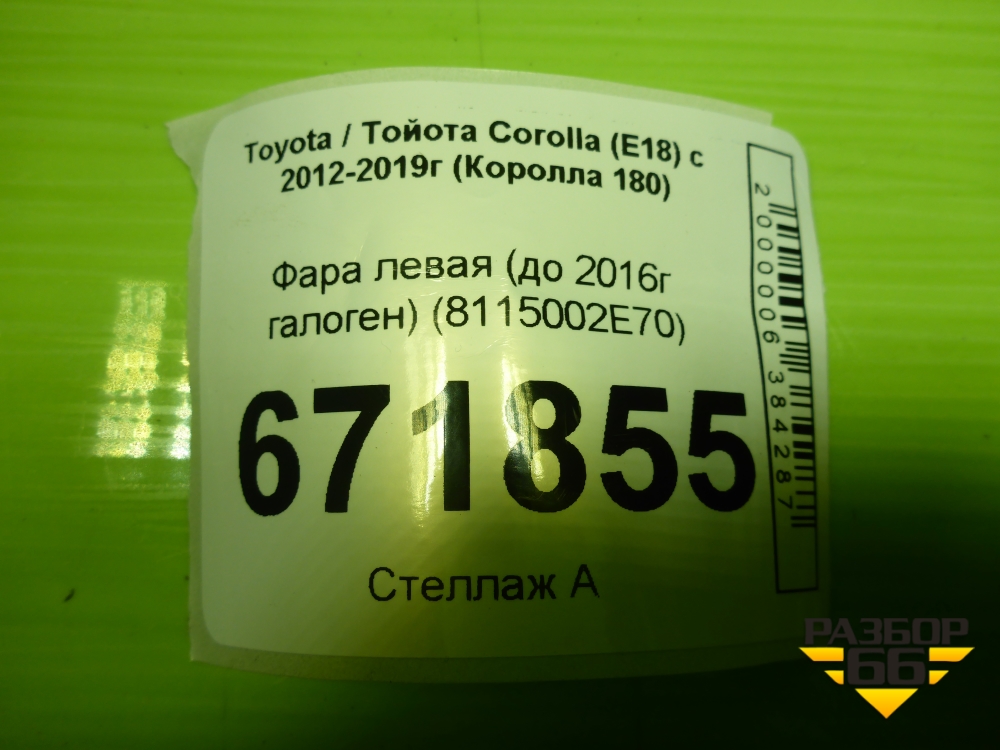 Фара левая (до 2016г галоген) (8115002E70) для Toyota Corolla (E18) с 2012-2019г (Королла 180) в Краснодаре