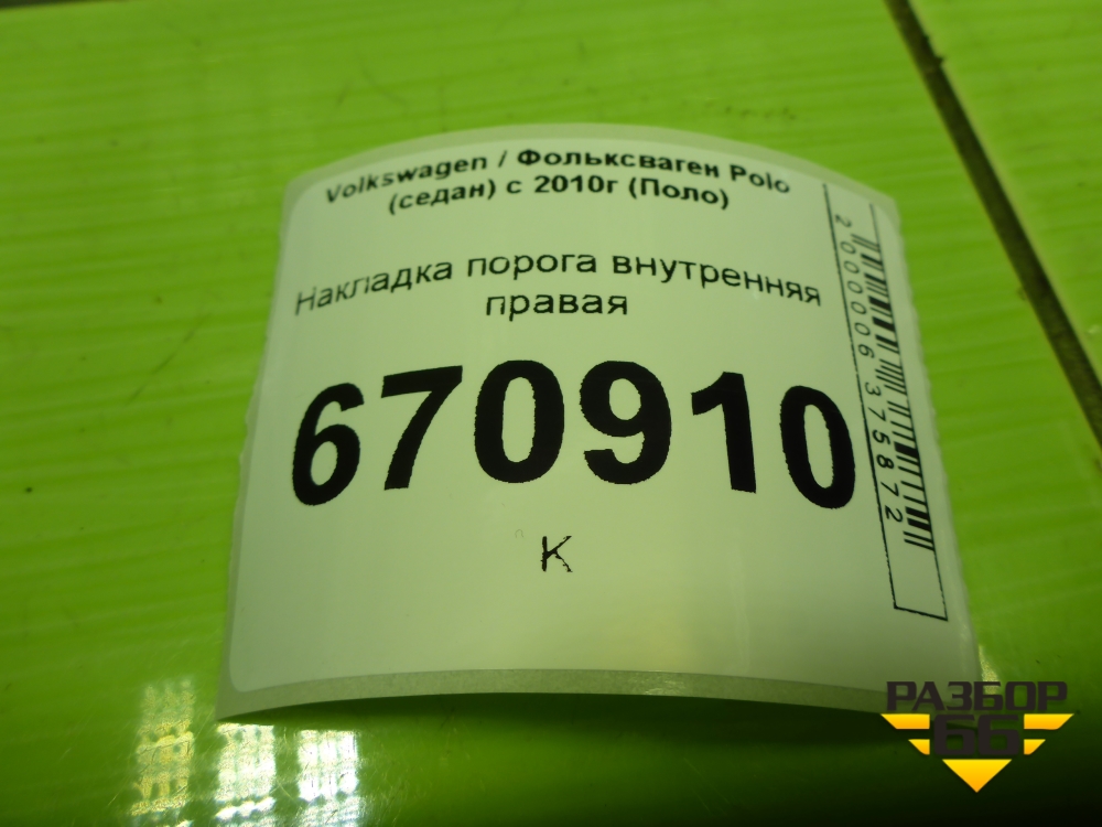Накладка порога внутренняя правая (6RU853372B) для Volkswagen Polo (седан) с 2010г (Поло) в Краснодаре